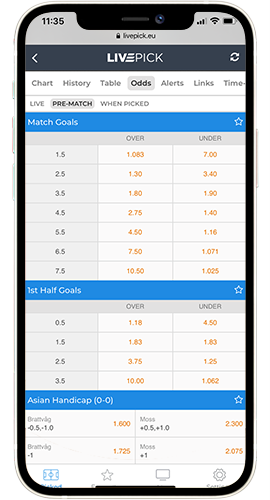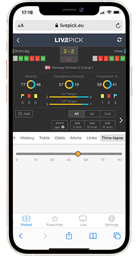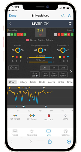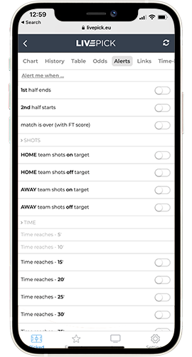 LivePick has picked an interesting match for you, but don't know if to bet? Set an alert when your team shots on target once more. Or when the second half begins, etc. You don't have to wait, just set up an alert!
