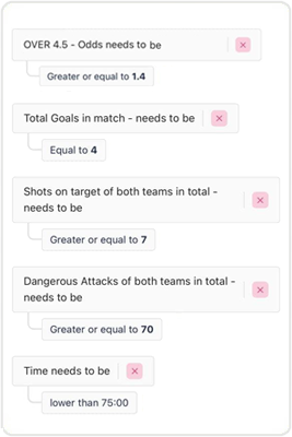 Define the criteria according to which livepick should pick matches. You can use in your filters more than 100 conditions. Attacks, Dangerous Attacks, Shot on target, Shot off target, Corners, Cards, Goals, live odds, prematch odds and many more.