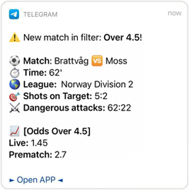 You can pair your LivePick account with your Telegram account or download our Android app. And when some match meets your criteria, we will immediately send you a notification to your mobile phone.